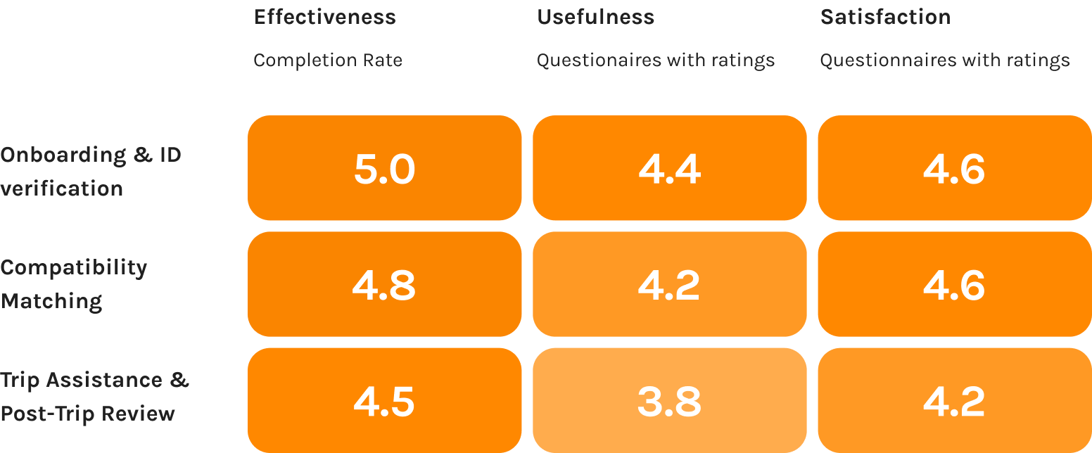 It was very rewarding to see that the testing result for the last round was very positive. Despite some concerns were still remained on the usefulness of post-trip review, the metrics clearly indicate that the prototype has been greatly improved.
