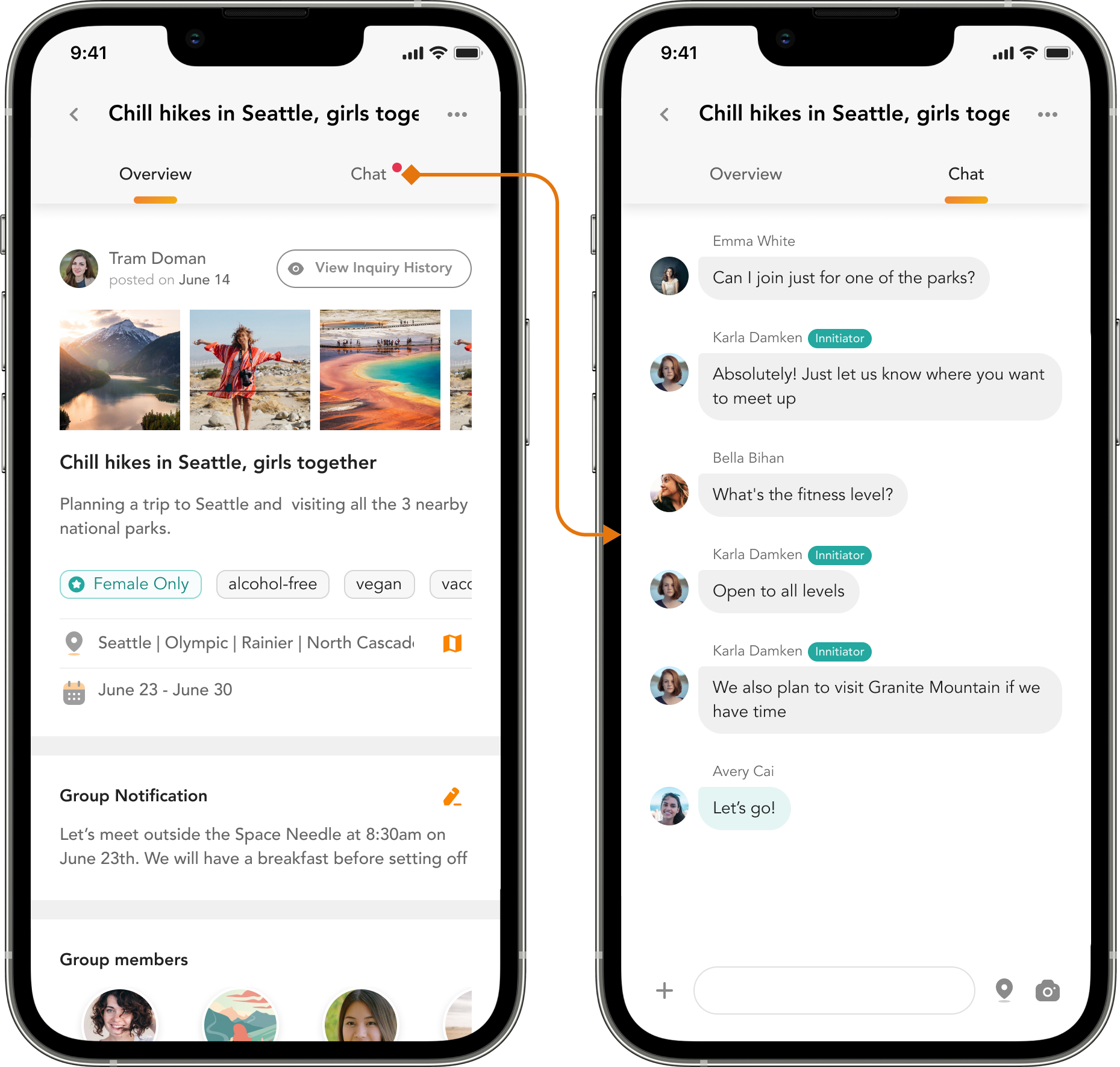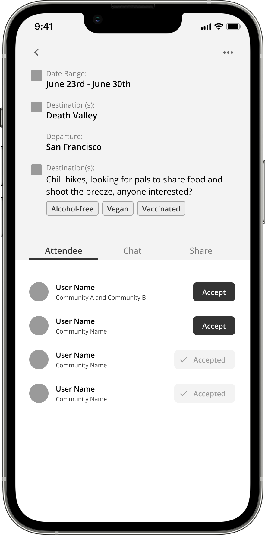 Based on the feedback we got from user testings and the volumn of MVP, I decided to cancel the "Share" tab and add "Group Notification" feature on the Overview screen.