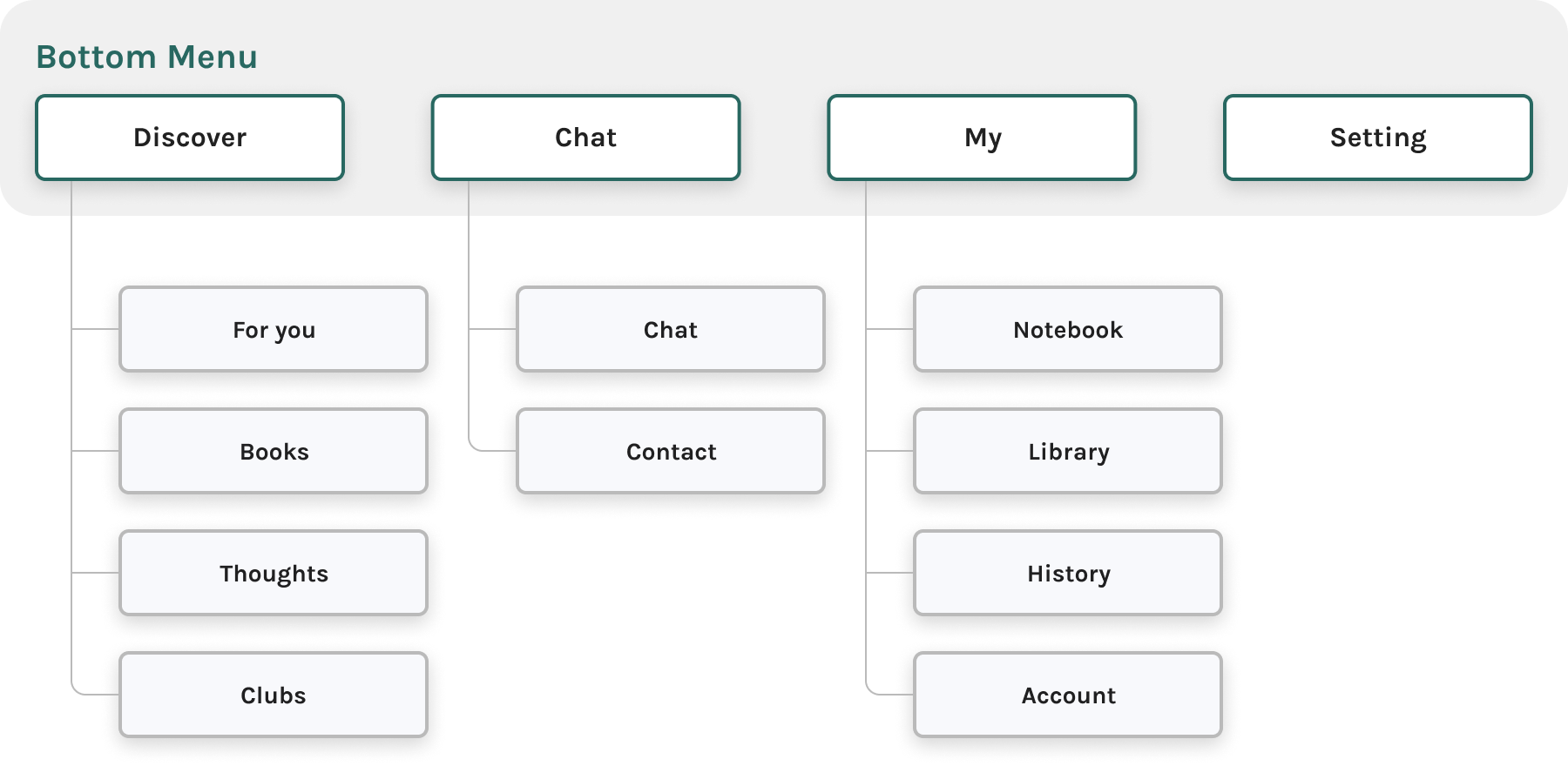 All the major categories (books, thoughts, clubs) are in the “Discover” Panel, which makes the secondary tab bar more important than the primary navigation.