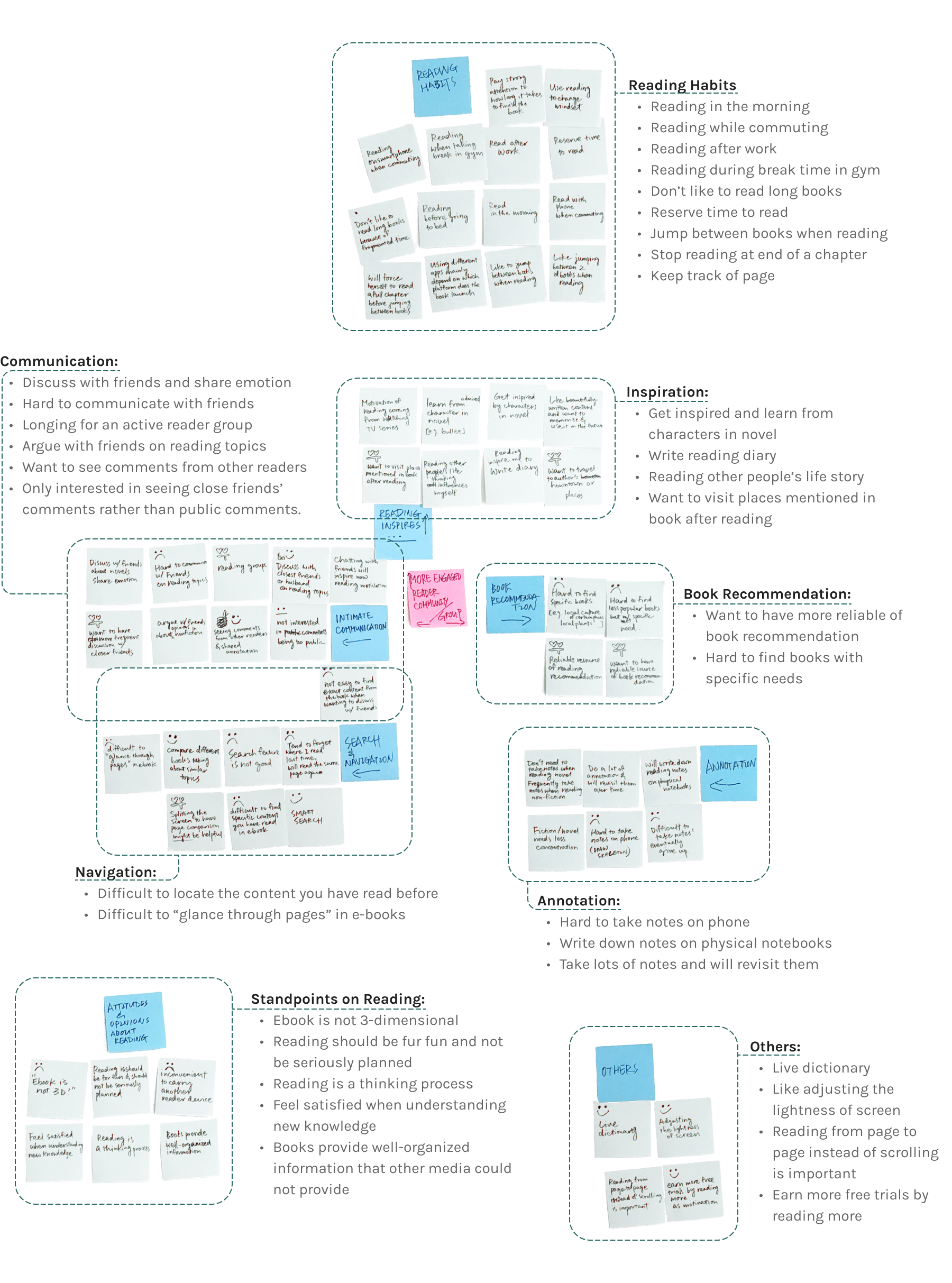 Research questions were focused on three major aspects: reading habits, reading motivations and stories in regards to e-book reading. The insights were collected and re-categorized into an affinity map shown as follows.