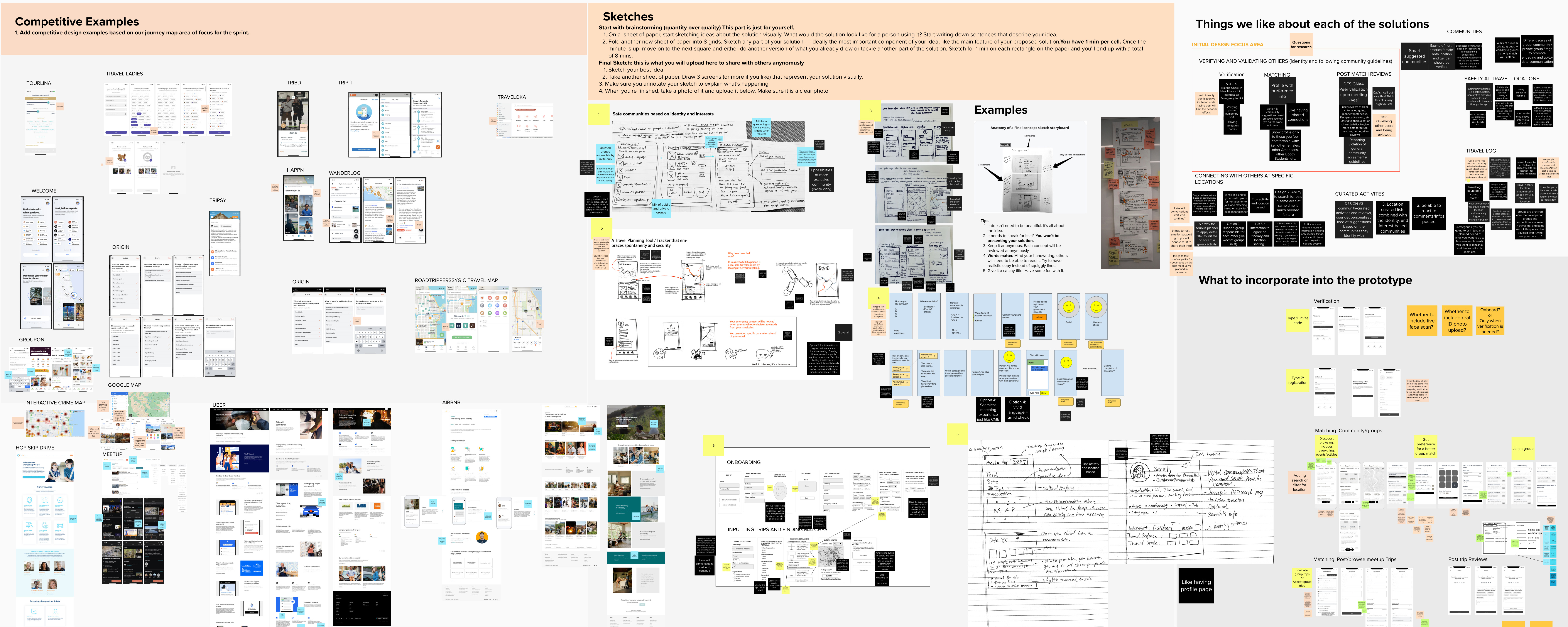 At the end of the workshop, we identified 3 design areas/strategies for MVP, which we believed could potentially lead to a better alternatives for finding travel partners, with improved security and compatibility.