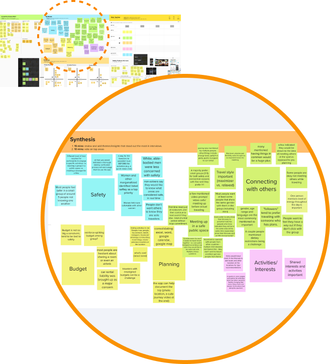 In a subsequent product workshop, we summarized all the insights we've collected and re-categorized them in an afinity map. We have discovered that solo travelers tend to look for travel partners via online forums & platforms, despite rampant frauds & inefficiencies which accompany these platforms. Consequently, lots of concerns focus on safty and social aspects.