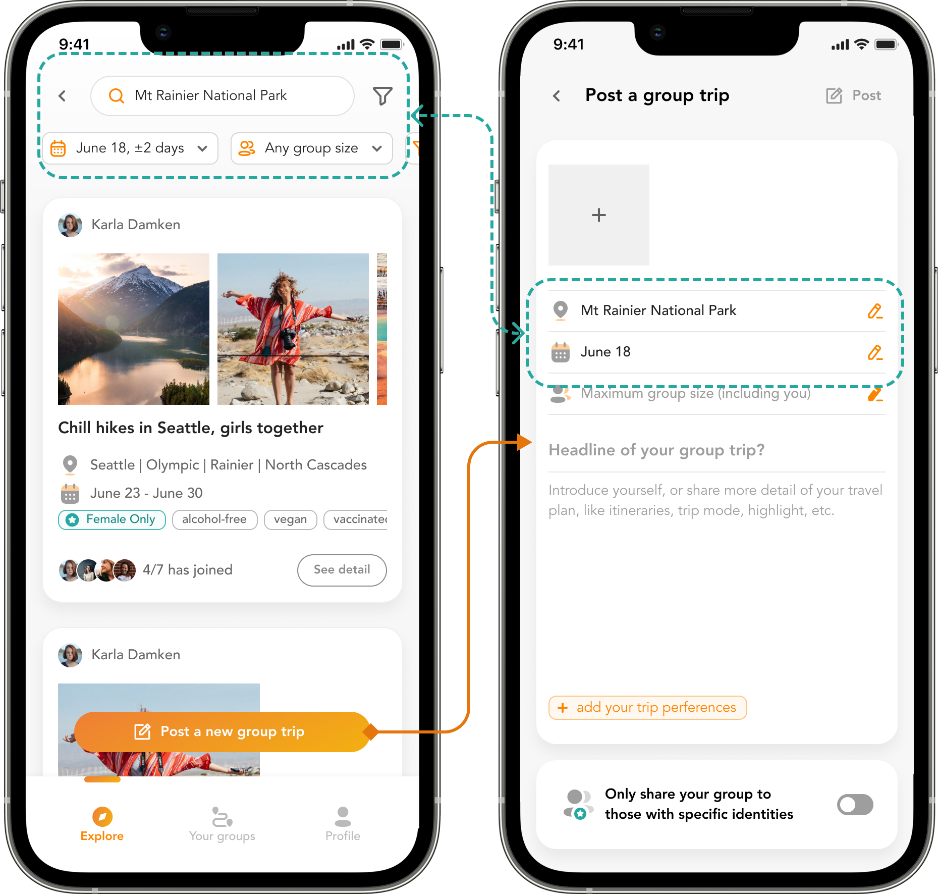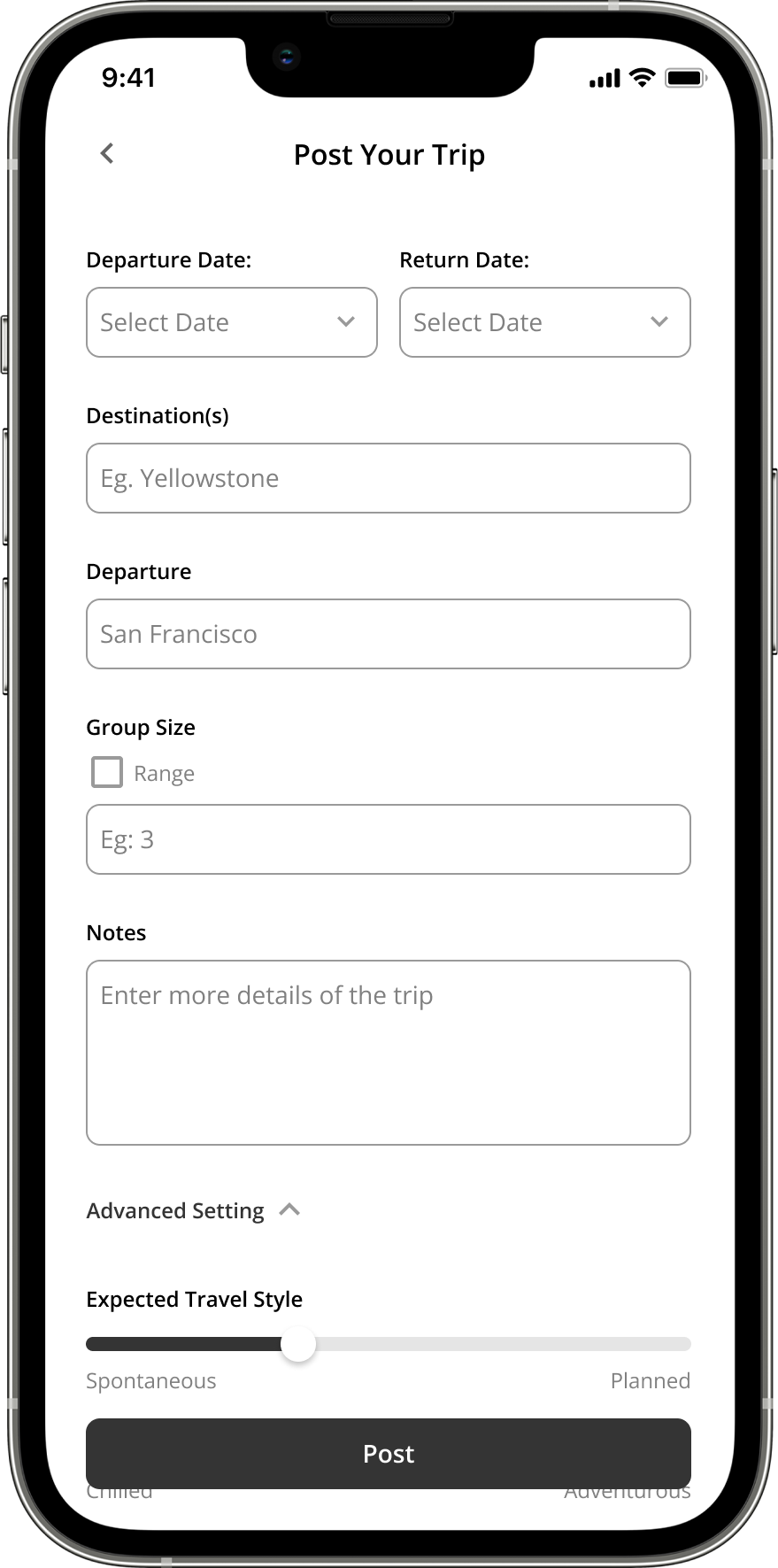 When a user search existing groups and decide to post one instead, he/she will be directly taken to a screen where the destination and time range has been filled out based on the search content.
