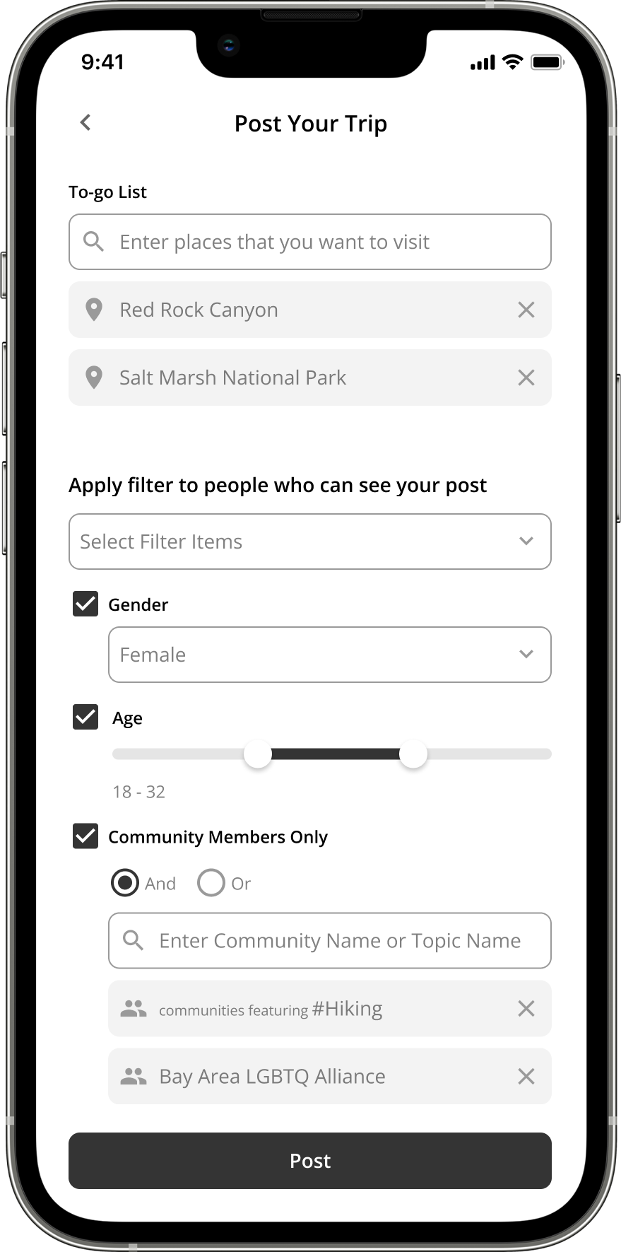 Users have the option to only share the group to people with certain identity that they share. The identities users filled out when signing up will become show in here as options.