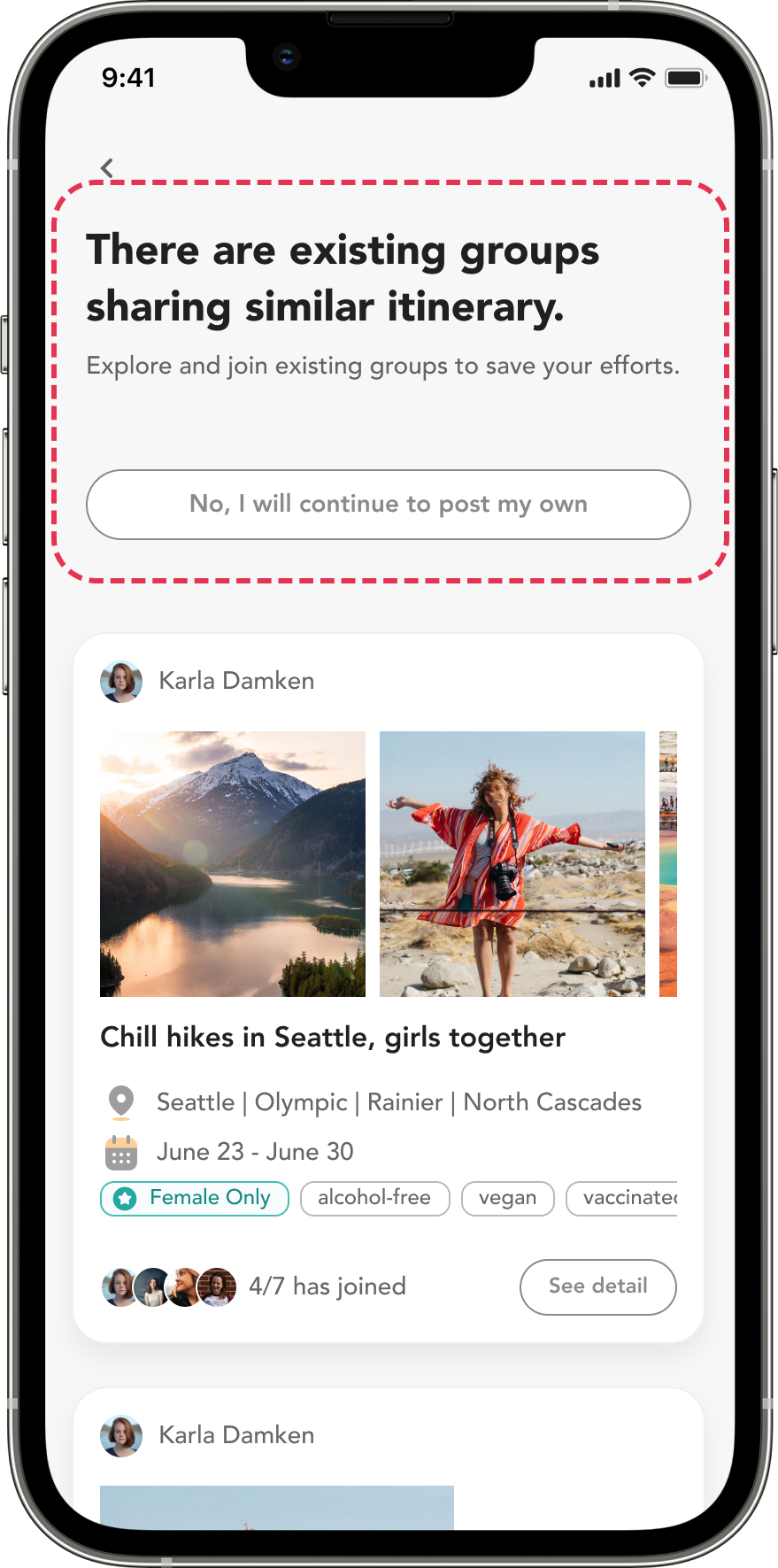 When a user post a group, similar ex. groups will show up before user get to the actual post screen.