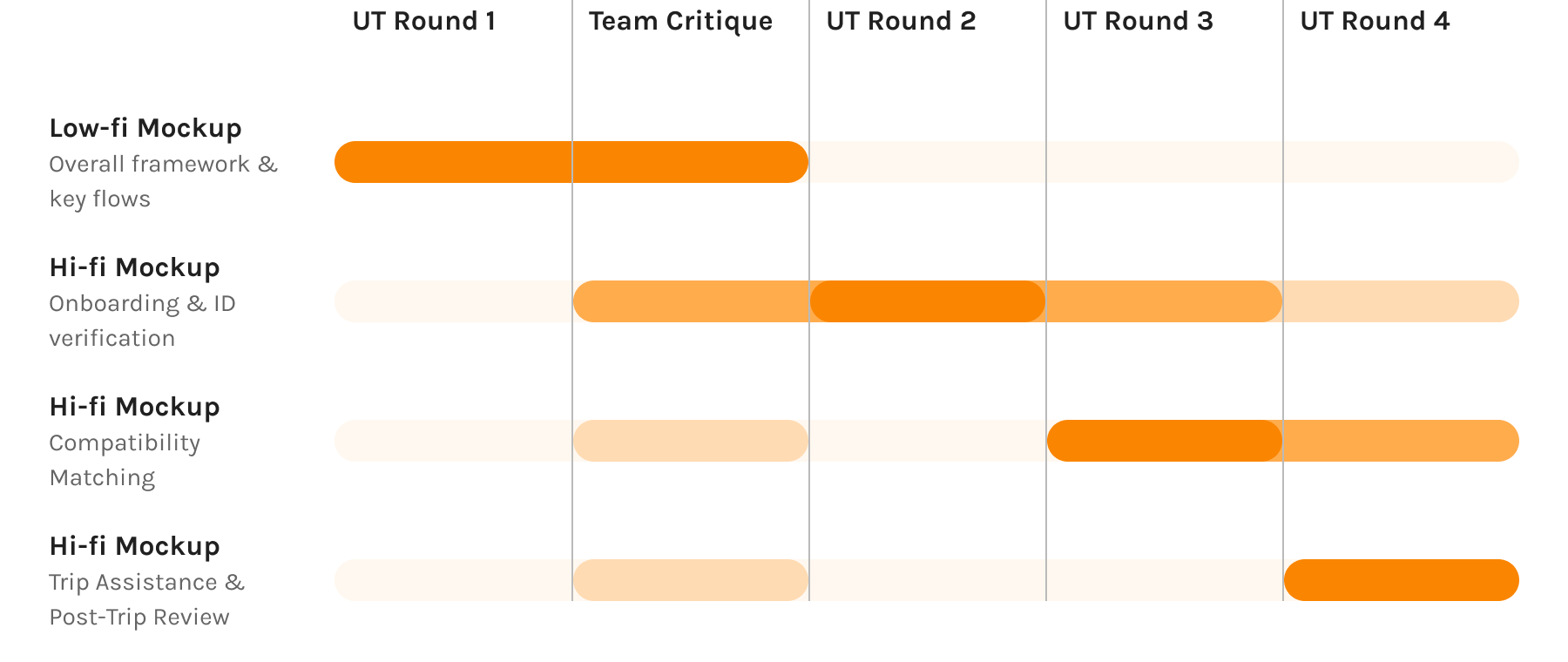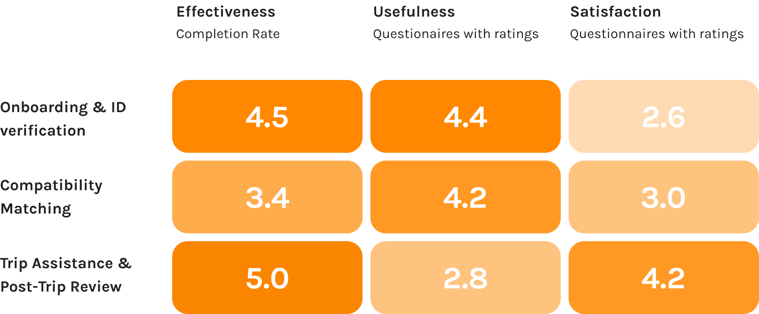 The "heat map" below has revealed very interesting pattern. Clearly for the first two design area, it was mostly usability issue, but for the post-trip review portion, users were questioning its usefulness. This indicates necessity to re-evaluate the feature from the product level.