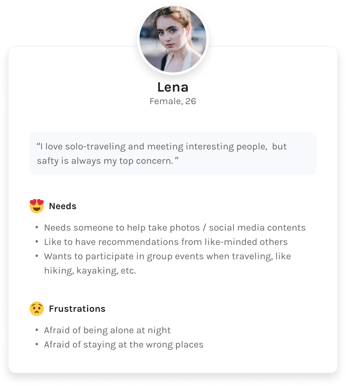 Earlier secondary research show that most solo-travelers are in the 25 to 34 year age group. And from our user interview, people who raised concerns on safty and social issues are primarily young females. We believed this is the pain points that our product needs to focus on. As a result, the persona reflects all the typical characters from our early studies.