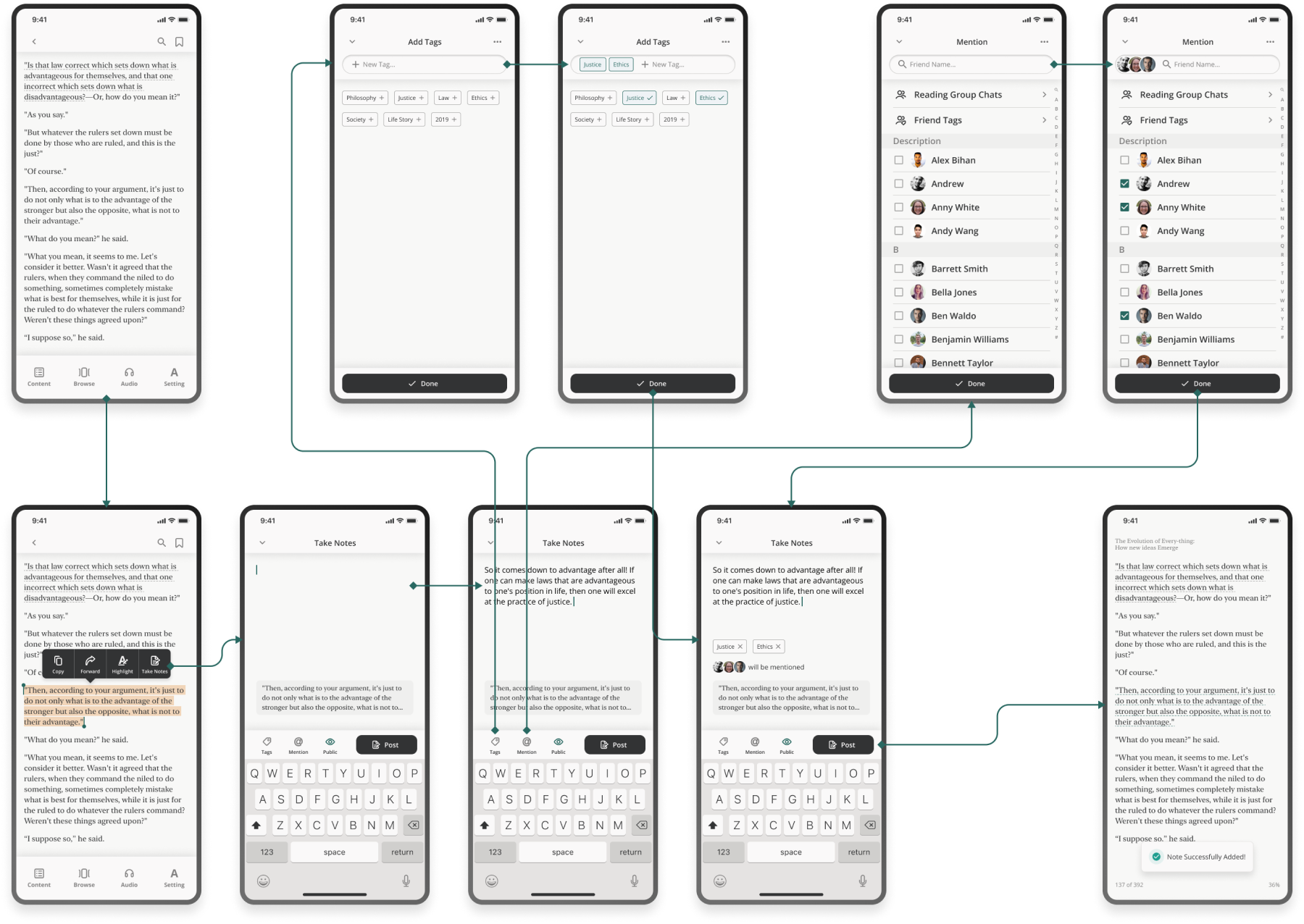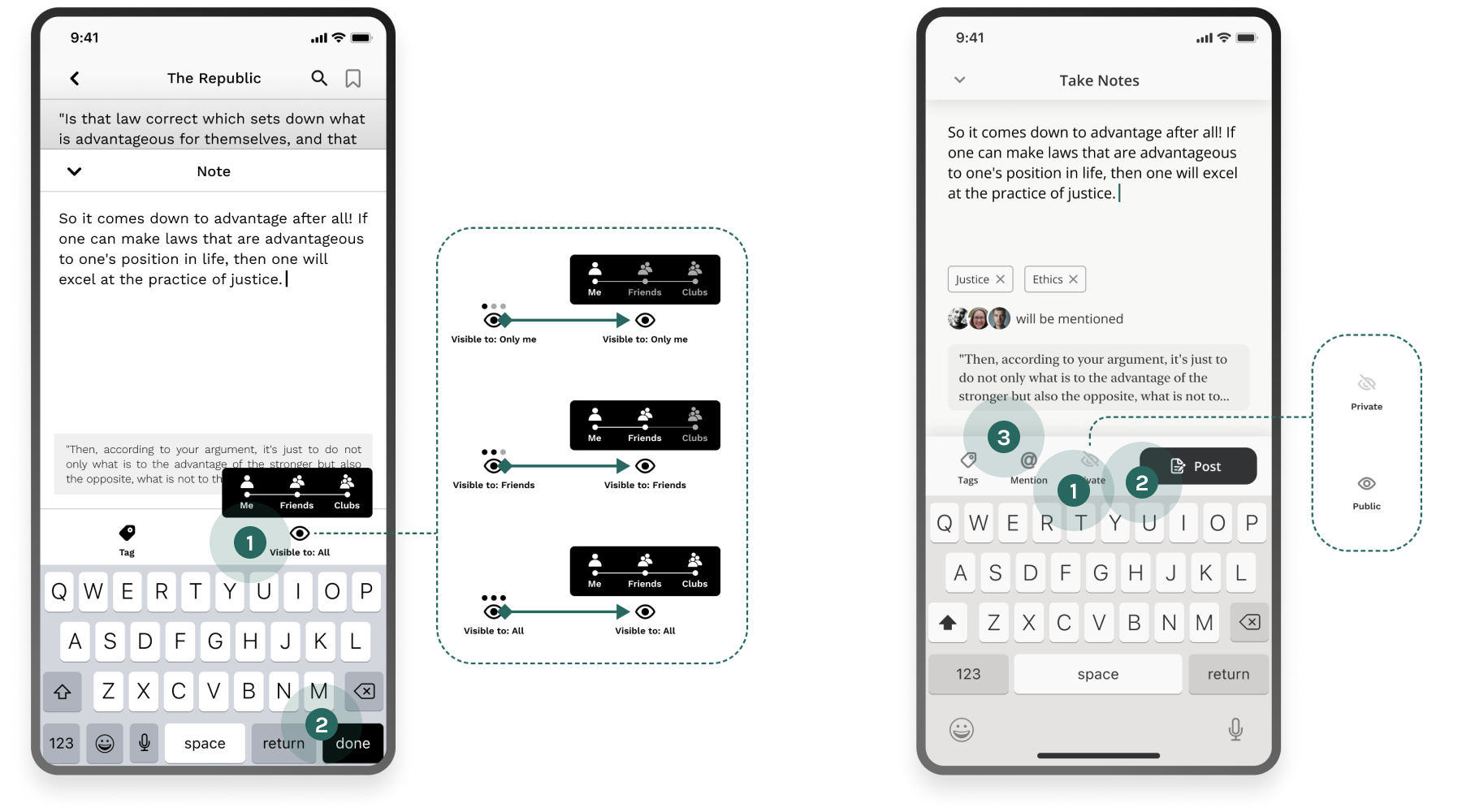 When doing annotation and taking notes, users can add tags to notes for managing purpose, and decide if it is public or private. In addition, users can mention specific friends in the note, regardless of whether it's public, the target people will get notified and access to the note.