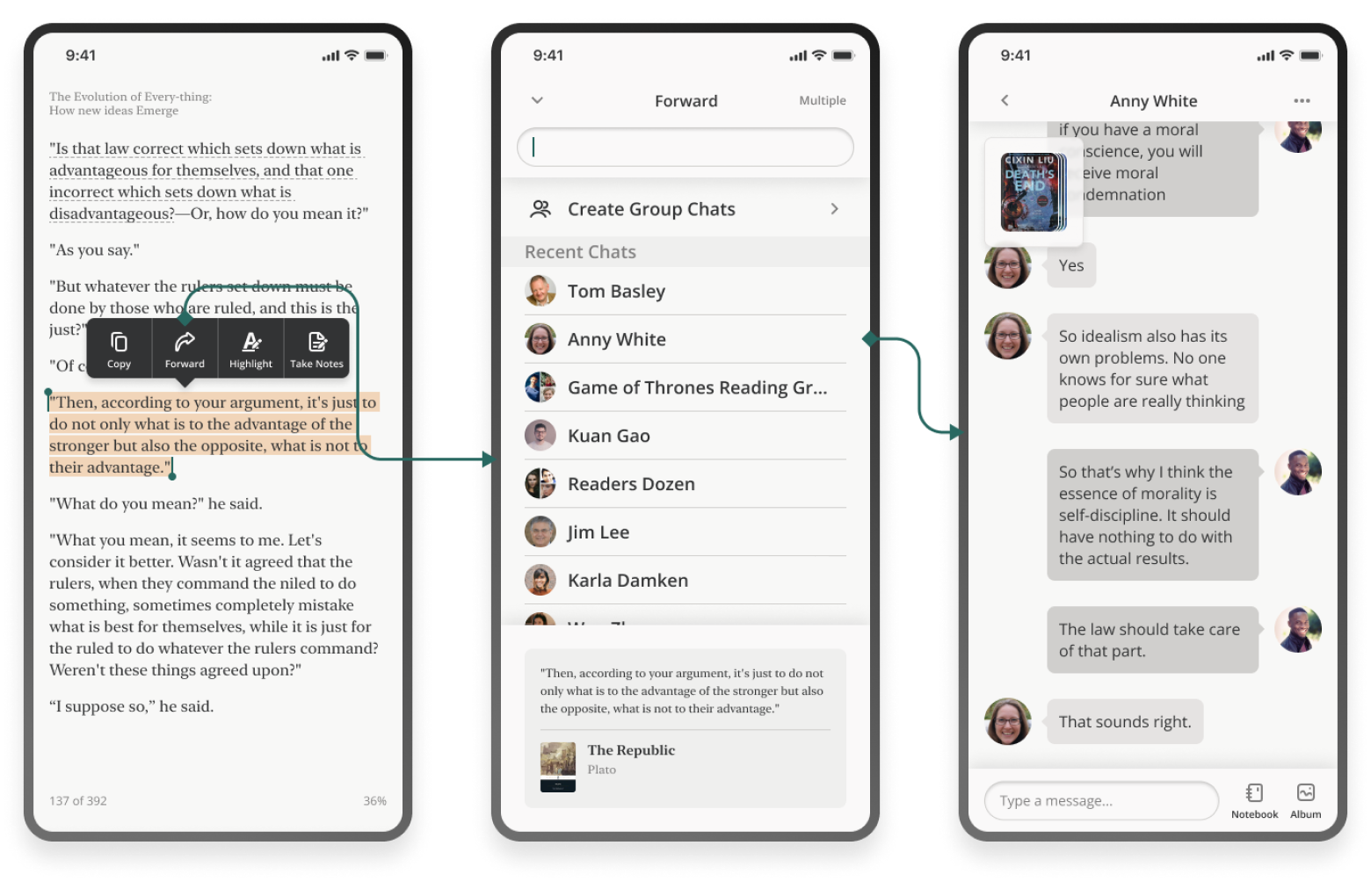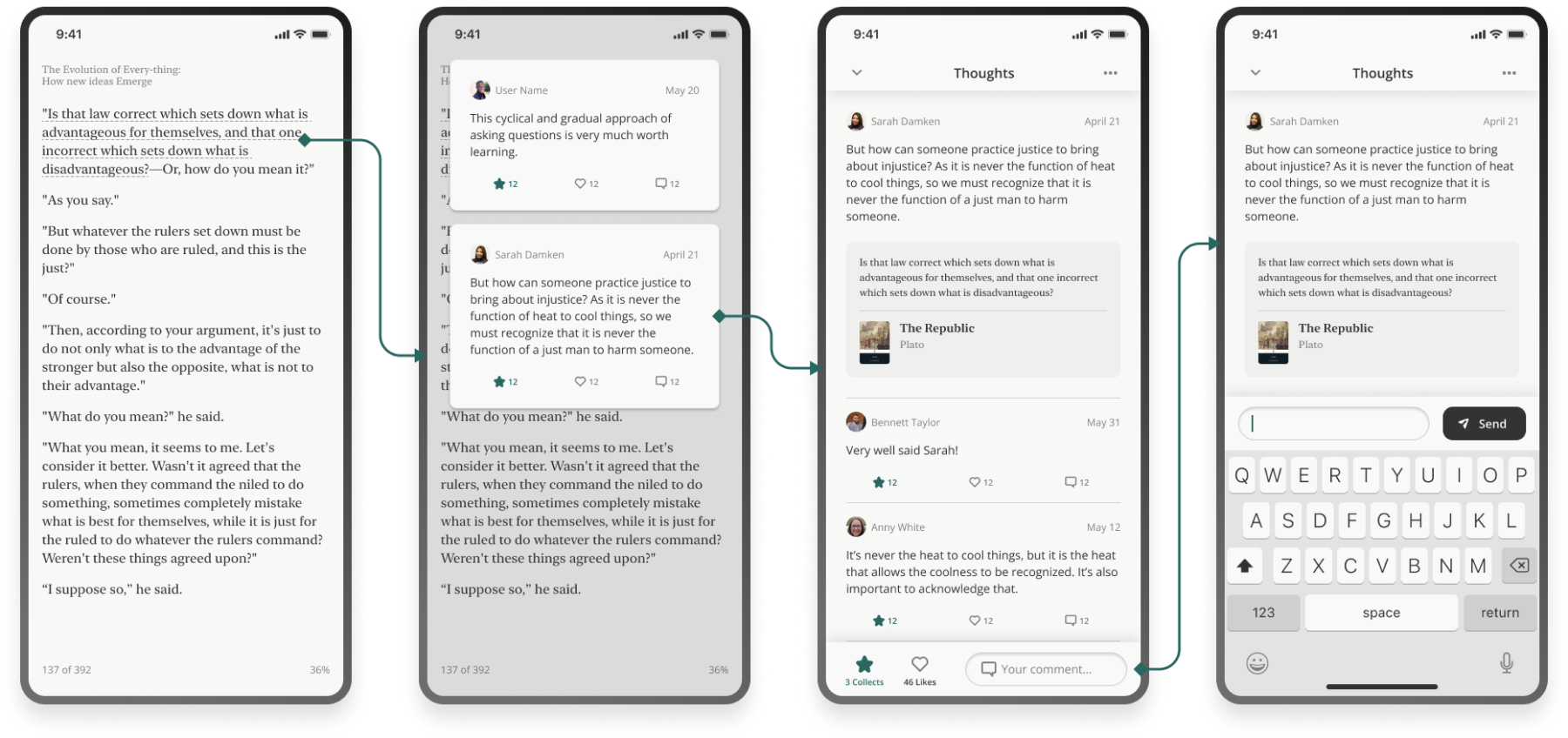 Users will be able to see other people's public notes when they read. They can have a public discussion by commenting under the notes. Users can also comment directly below other people's response.