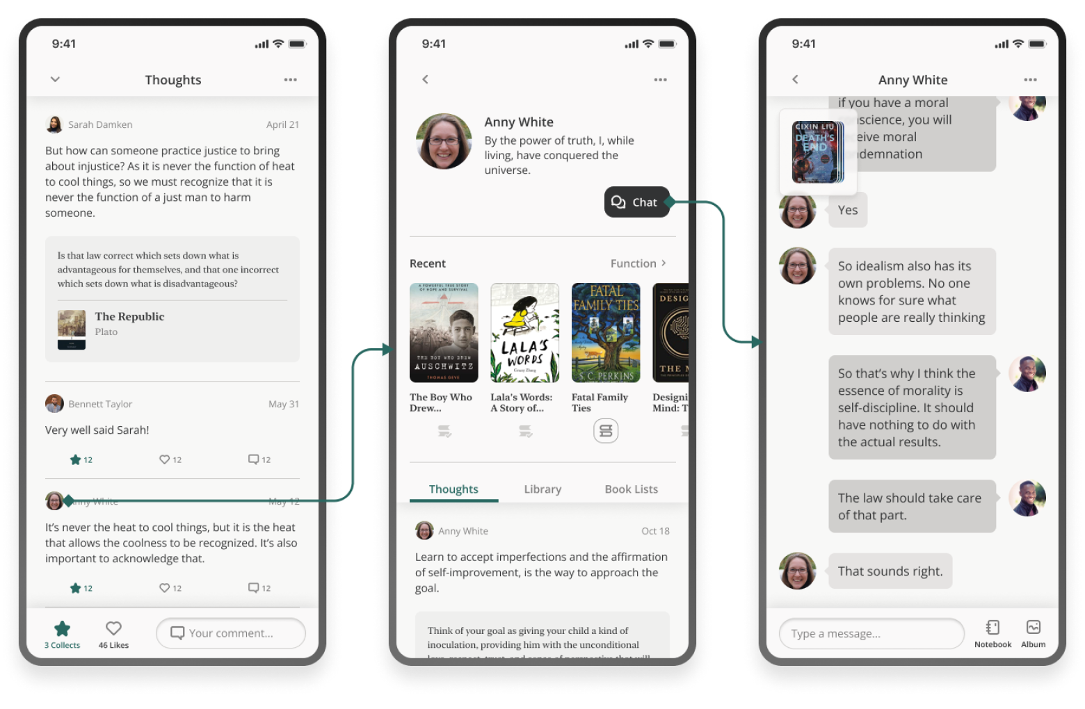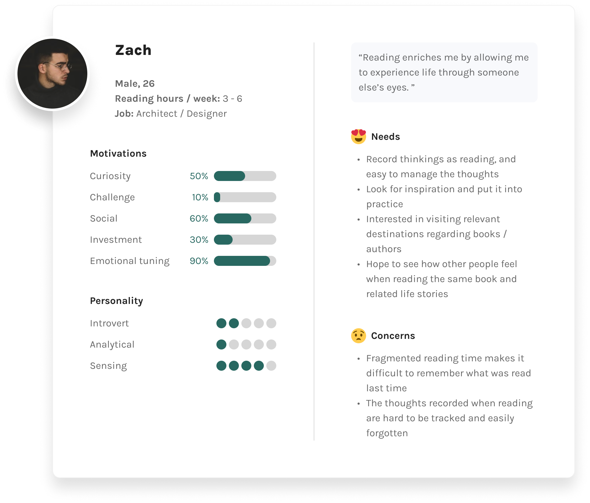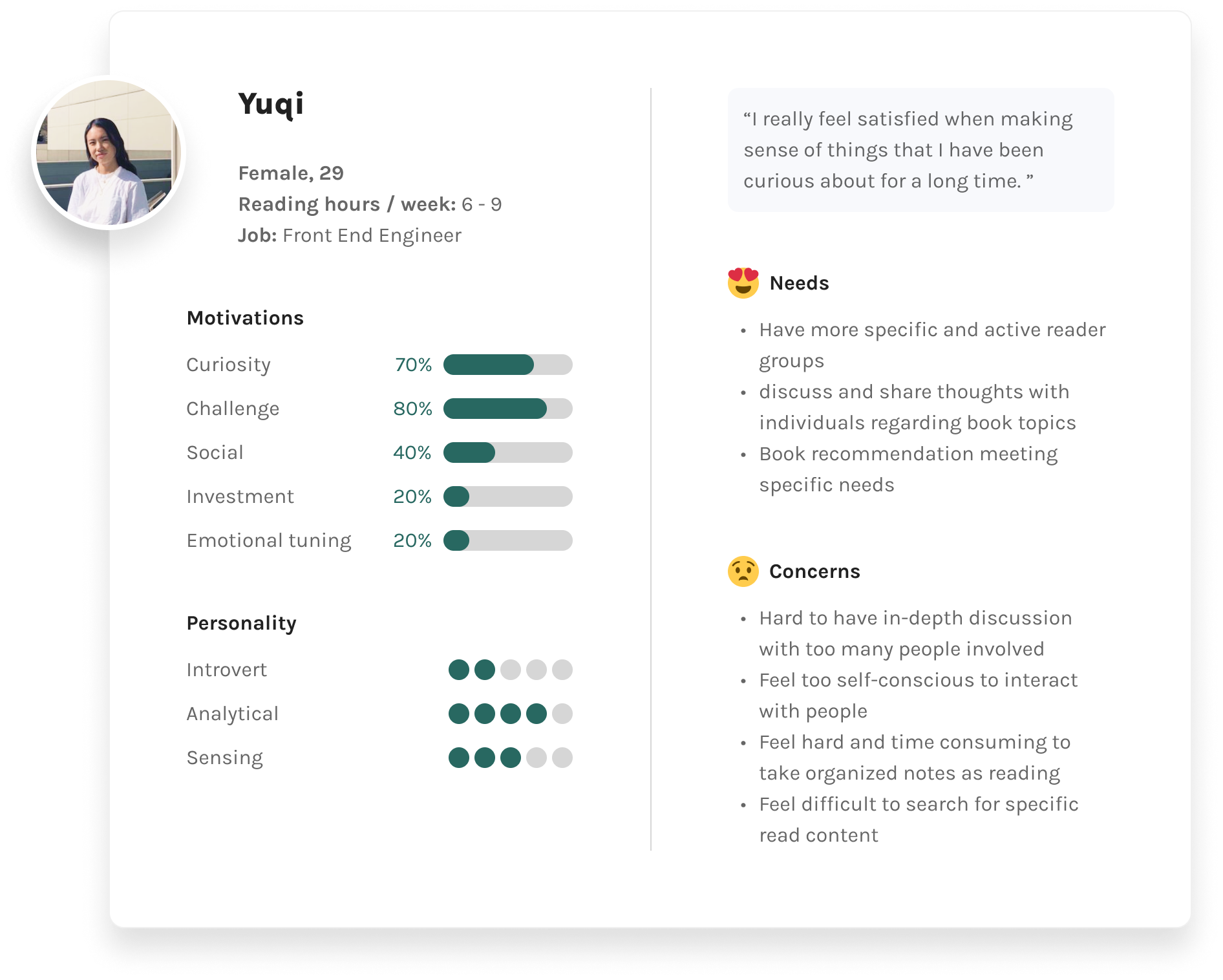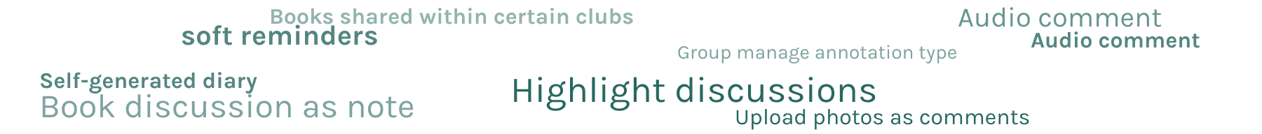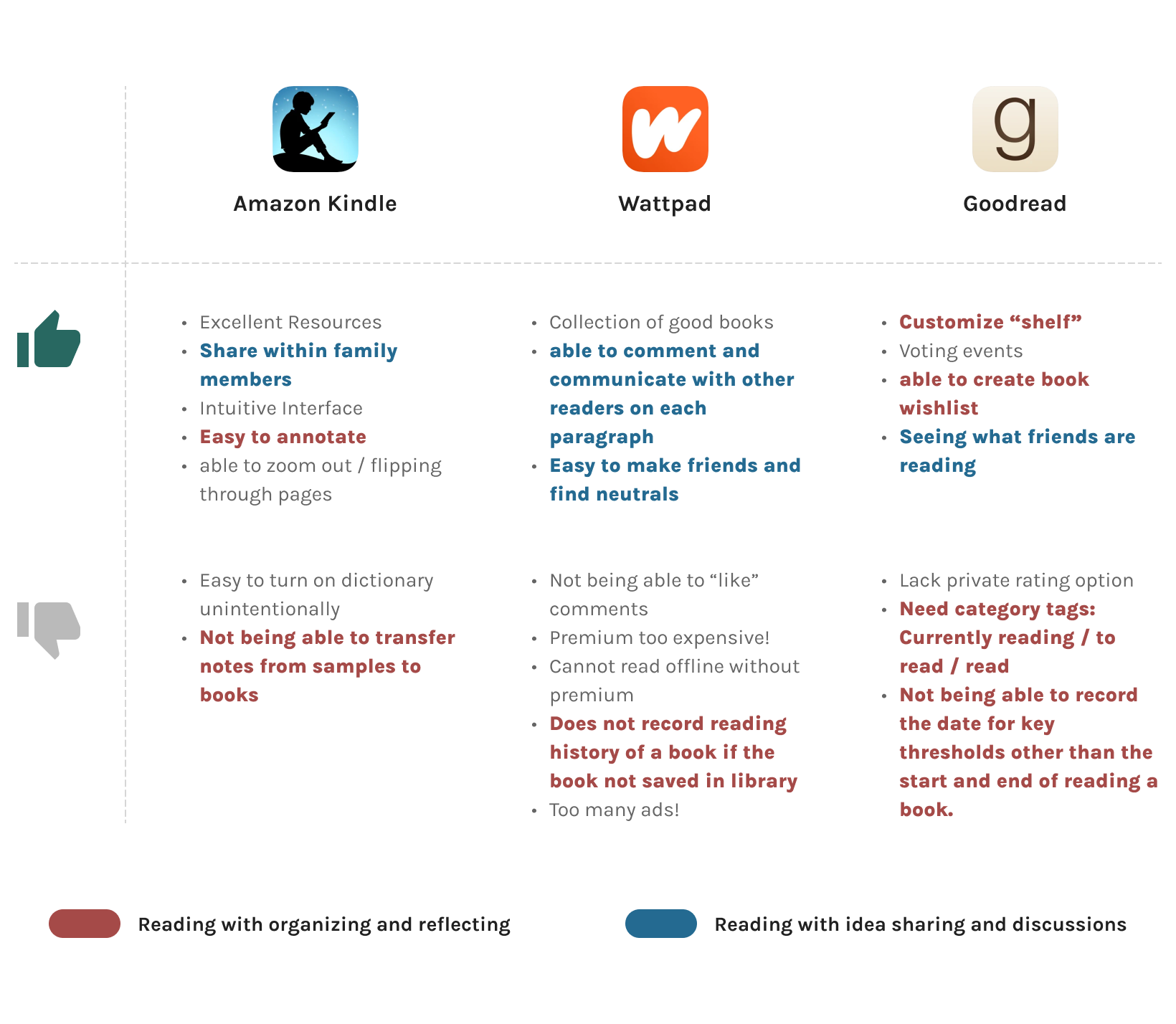 From secondary research, I learned that e-readers' needs to discuss, reflect and comprehend book content is not fully met. It's a composited result of multiple phenomena, including fragmentation of reading time, the increase of non-fiction reading, lack of reading management tools.