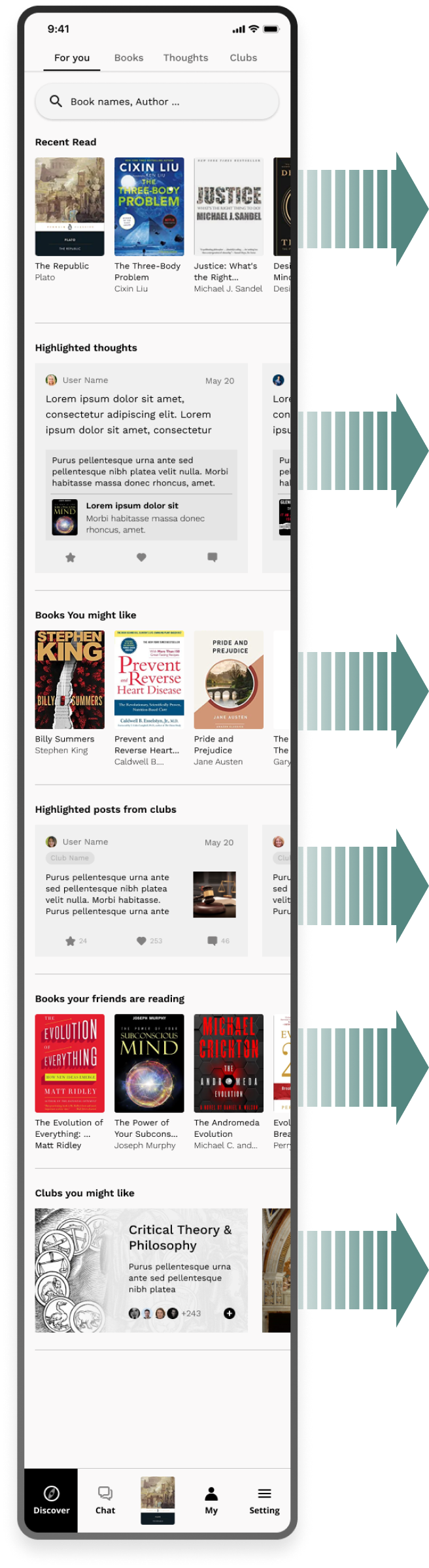 All the major categories (books, thoughts, clubs) are in the “Discover” Panel, which makes the secondary tab bar more important than the primary navigation.