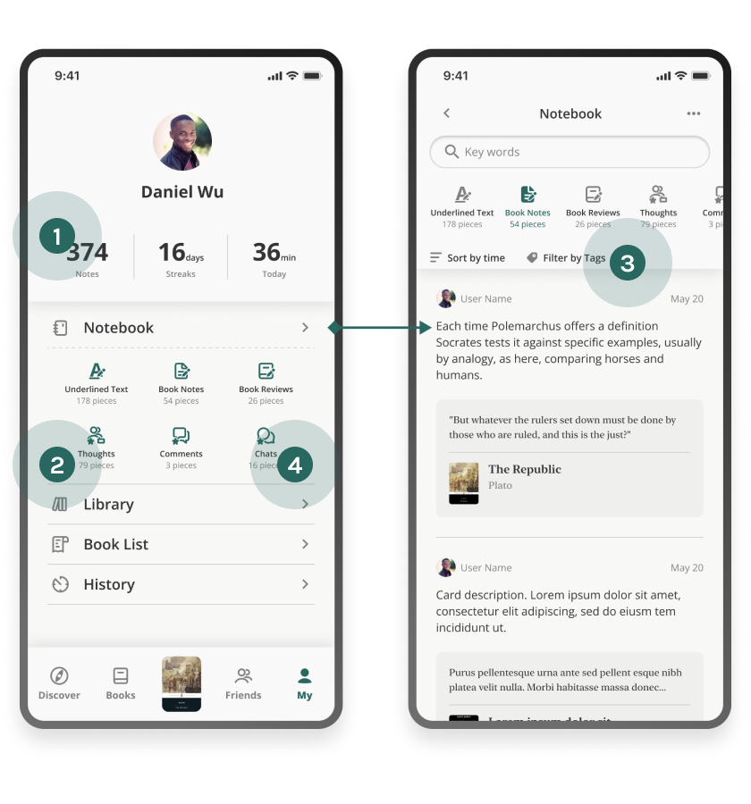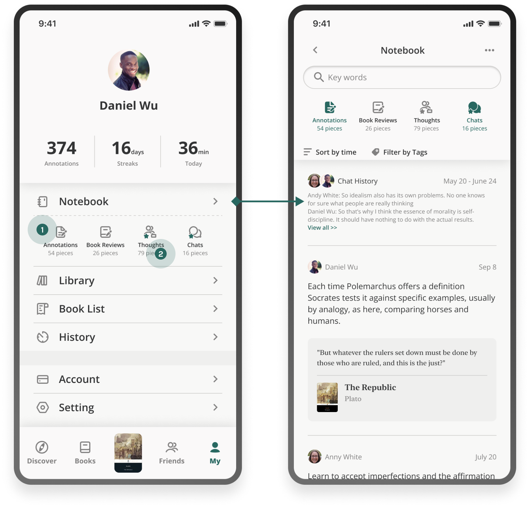 Earlier research have shown that many people are frustrated about worse comprehension and being easy to forget what's been read. Therefore the notebook feature is important. In Reapal, users are able to keep track of all the histories, and review all the annotations and discussions in different manageable orders.